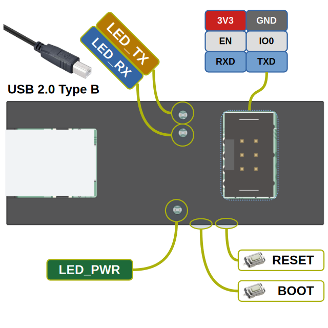 ESP-Prog can easily connect to a PC with the use of only one USB-B cable.