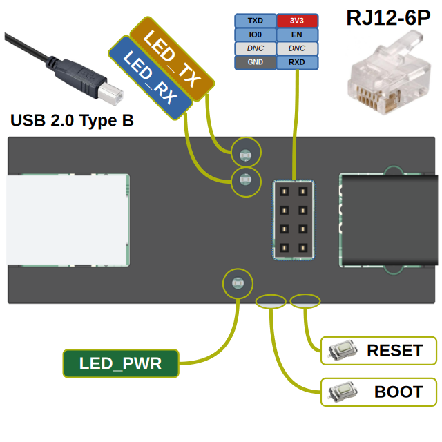 ESP-Prog can easily connect to a PC with the use of only one USB-B cable.